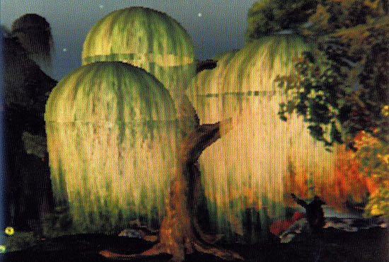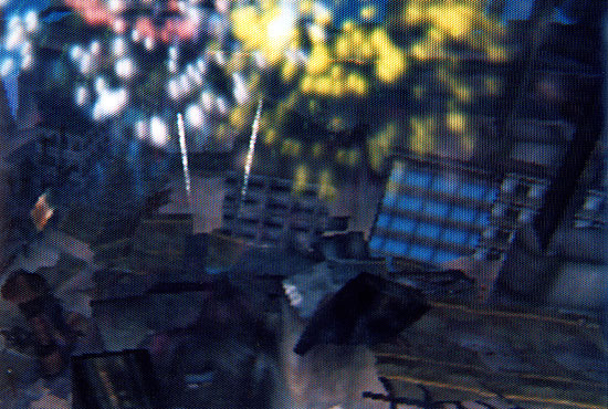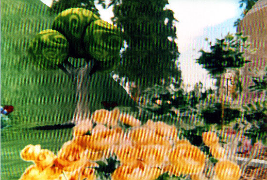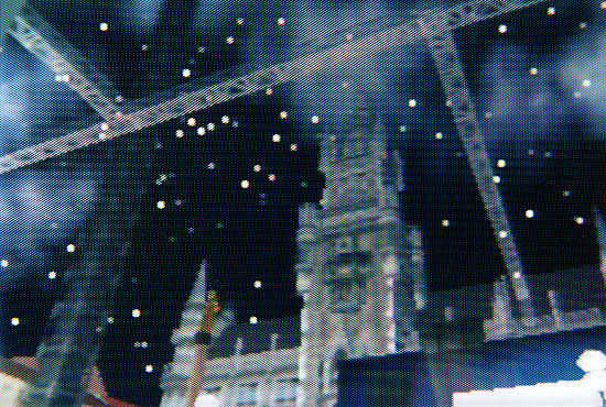 My travels through one of today’s self-proclaimed leading online worlds, SECOND LIFE, took place in the fall of 2008 from my home in Surrey BC, Canada. I went sightseeing in several of its virtual domains and photographed my screen from my embodied existence in real time and space similar to how I would approach my ‘real life’ holiday snapshots. The large C-prints produced from these negatives give presence to the ‘woolly’ RGB phosphors of my CRT monitor: the phosphor dots simultaneously deconstruct the image as a ‘light show’ and call up material associations with, for example, fabrid or an embroidered surface.